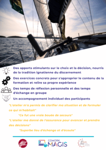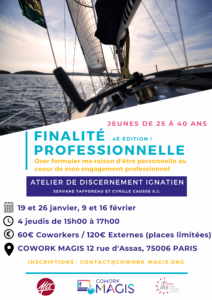 19, 26 janvier, 9 et 16 février, atelier de discernement ignatien sur la finalité professionnelle « Oser formuler ma raison d’être personnelles au cœur de mon engagement professionnel », destiné aux 25–4 ans. En 4 jeudis, de 15h à 17h au Cowork Magis (75006 Paris).