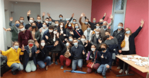 4 épreuves, 4 ronds de couleur différente, qui nous guident à travers l’église comme dans un jeu de piste. La première épreuve, nous conduit à Alfonso, dans une étrange attitude, au pied d’un portrait de Madeleine Delbrêl. Au pied de quelques statues, des croix en scotch blanc… une invitation ? Nous prenons place sur les croix, nous efforçant d’imiter la statue correspondante. Le temps d’admirer l’effet d’ensemble, Alfonso sort de sa réserve et nous remet une enveloppe… une fois mis dans l’ordre, le message apparaît : « inventer les passages ».