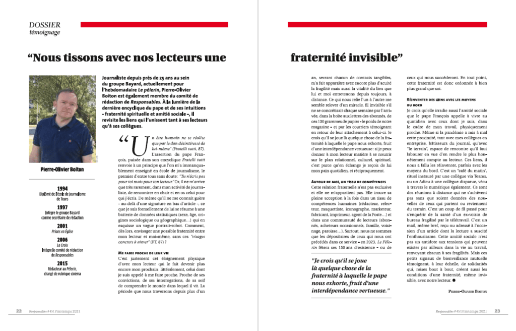 Dans le numéro 451 consacré à l’encyclique du pape François sur la fraternité « Fratelli tutti », Responsables a confié la plume à Pierre-Olivier Boiton, journaliste à l’hebdomadaire Le pèlerin, et membre du comité de rédaction de la revue du MCC. À la lumière des intuitions du pape dans son encyclique — fraternité spirituelle et amitié sociale -, il revisite les liens qui l’unissent à ses lecteurs, à ses collègues.