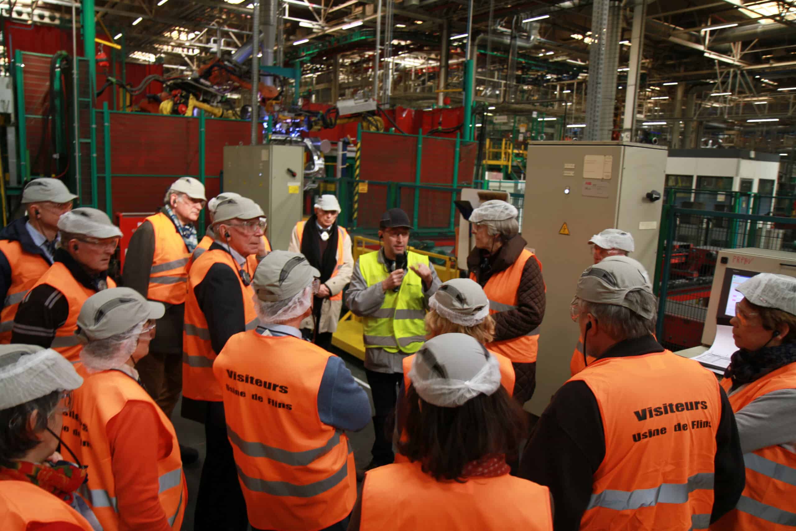Au détour de l’étape suivante, on aperçoit la centrale électrique au gaz qui alimente le site en énergie et, à moins de 100 m, la Seine. Renault utilise peu le fleuve, en-dehors du pompage et du rejet d’eau via une station d’épuration lors du cycle industriel, mais prévoit néanmoins d’expédier, à terme, ses marchandises par transport fluvial. Nous voici au département « Tôlerie », automatisé à 99 %, où les tôles sont assemblées entre elles pour former la « caisse » des véhicules, au moyen d’impressionnants bras articulés de plusieurs mètres de haut. Bruits de visseuses, de soudure, de pièces clipsées, bips de robots (japonais souvent, allemands parfois), pluies d’étincelles : le spectacle est tant visuel que sonore. Effet « Danse avec les robots » garanti ! De petits chariots automatiques acheminent les pièces d’un « îlot » à l’autre. La présence humaine est quasi inexistante : tout au plus remarque-t-on quelques roboticiens veillant à la maintenance des machines, et des ouvriers en gants blancs contrôlant la qualité des soudures au toucher, dans un ballet de gestes cadencés, chorégraphiés, presque gracieux !